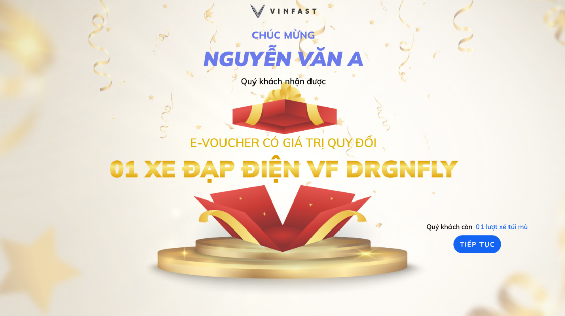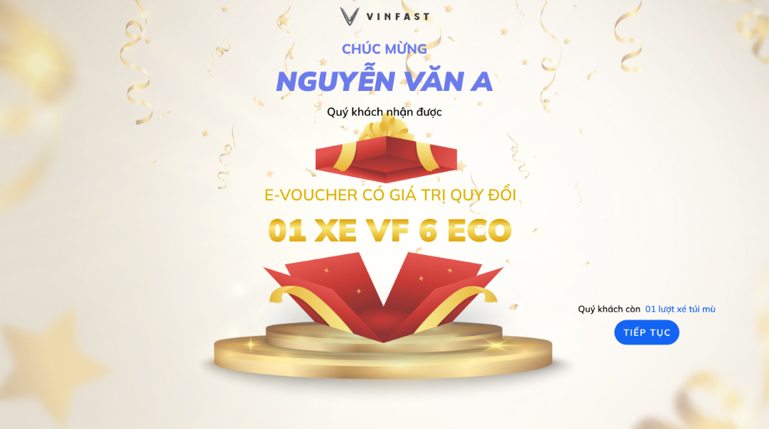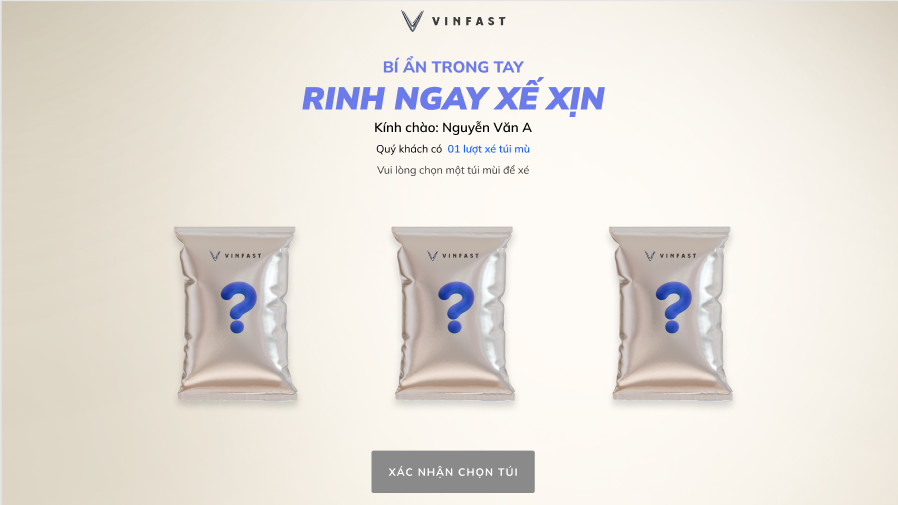 Mỗi khách hàng đủ điều kiện sẽ nhận được lượt tham gia trò chơi trực tuyến “xé túi mù” – một hình thức quay thưởng ngẫu nhiên trên website chính thức của VinFast. Cụ thể: