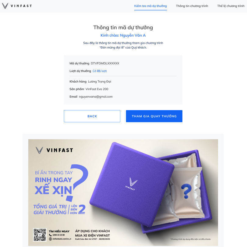 - Địa điểm trao thưởng: VinFast sẽ gửi mã E-Voucher trúng giải thông qua địa chỉ email Khách hàng đã cung cấp.